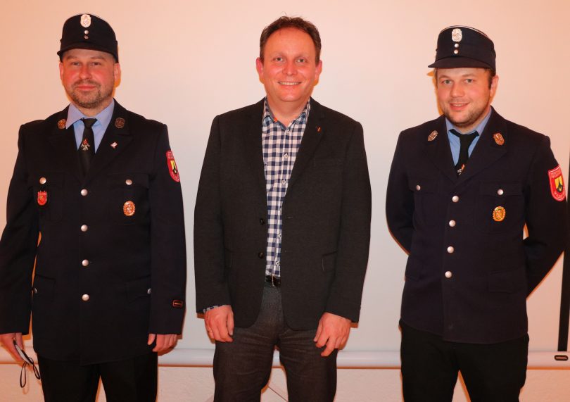 Bericht und Foto: Heinrich Rehberg – Florian Fischer (links) und Martin Zettl (rechts) bleiben auch in den kommenden sechs Jahren Kommandanten der Feuerwehr von Wildenwart. Die turnusmäßig anstehenden Wahlen wurden in der Frasdorfer Lamstoahalle unter der Leitung von Bürgermeister Daniel Mair (Mitte) durchgeführt.