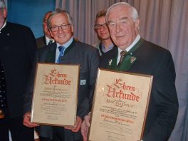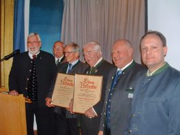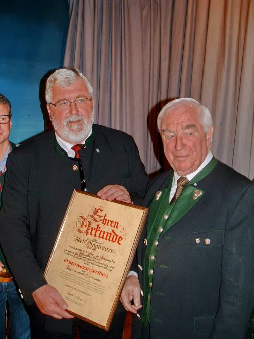 2. Sebastian Friesinger ehrt Adolf Dinglreiter mit einer Urkunde zum Ehrenvorsitzenden des Bayernbundes.