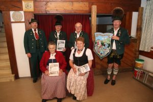 Vorstand Christoph Kaufmann (ganz rechts, mit der Geschenk-Tafel des Gauverbands anlässlich der 100-Jahr-Feier des Vereins) und sein Stellvertreter Florian Wörndl (ganz links) konnten verdiente Mitglieder zu Ehrenmitglieder des Vereins ernennen. Vorne (von li.): Johanna Buchner und Katharina Lampersberger; hinten: Sebastian Scheck und Josef Steinbichler.