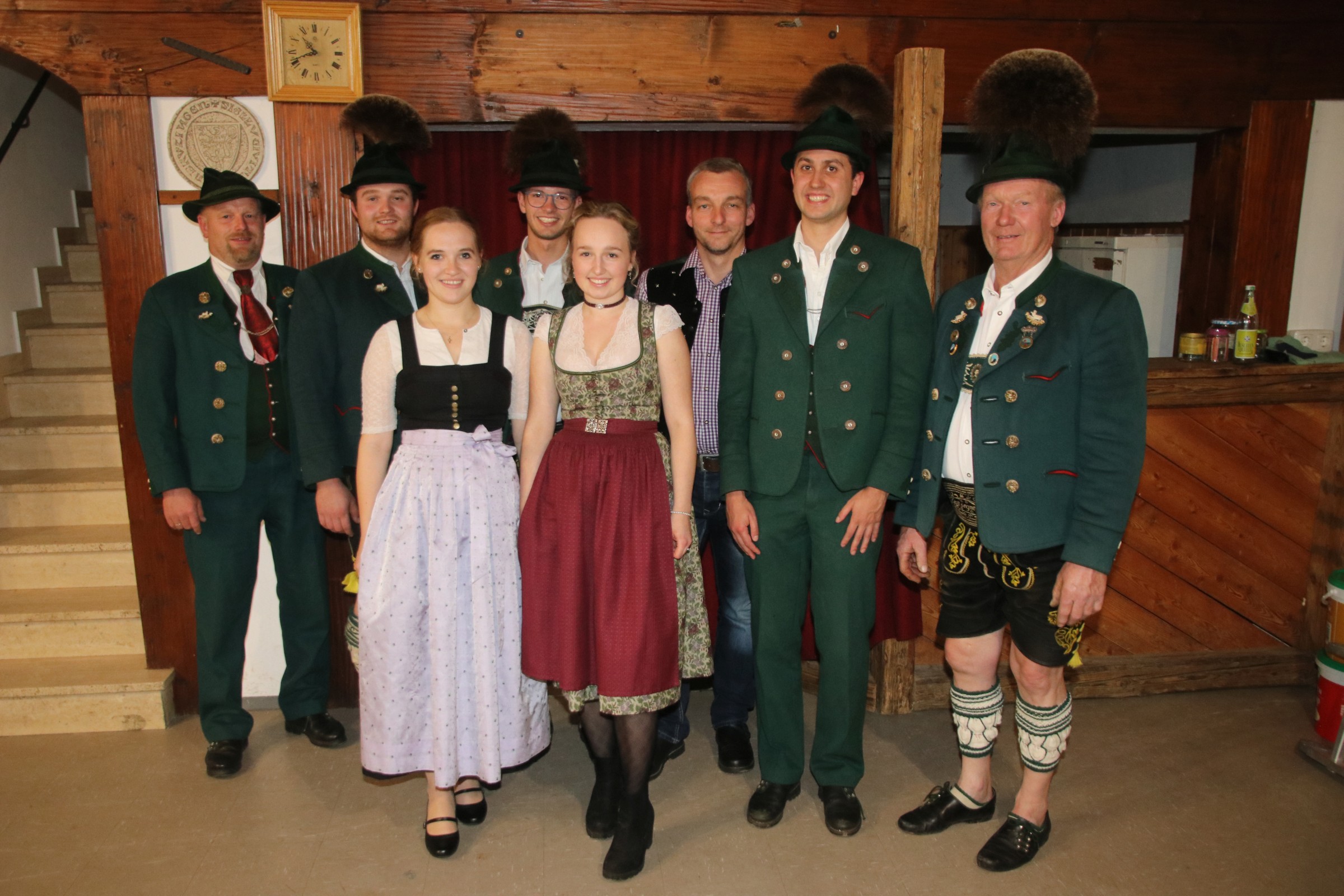 Vorstand Christoph Kaufmann (ganz rechts) und sein Stellvertreter Florian Wörndl (ganz links) zusammen mit den neugewählten Dirndlvertreterinnen (vorne, von li.) Katharina Wörndl und Katharina Pfaffinger, sowie den neuen Vorplattlern Christoph Kaufmann jun. und Lukas Feichtlbauer, dem Internetbeauftragten Lars Kuhtz und den neuen Pressewart Michael Hötzelsperger