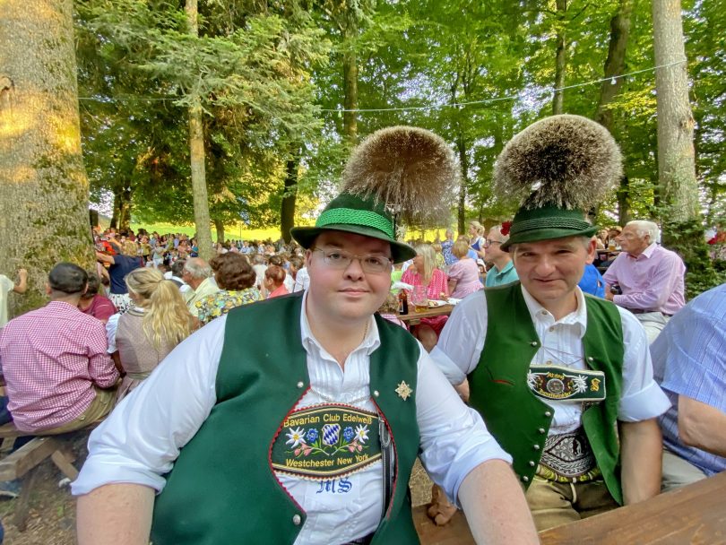 Michael Schneider, Vollbluttrachtler vom Bavarian Club Edelweiß Westchester in New York beim Gauverband Nordamerika besuchte dieser Tage das Gaupreisplatteln vom Gauverband I in Bad Endorf. Dort traf er Martina Huber vom Trachtenverein „Die lustigen Wildenwarter“, die er schon von seinen Münchner Studienzeiten kannte und sie erzählte ihm vom abendlichen Waldfest des Atzinger Trachtenvereins im Buchenwald von Munzing und dass sie dort mit der Wildenwarter Blasmusik spielt. Das wollte sich der 24jährige Opernsänger und Antiquitätenhändler nicht entgehen lassen und fuhr mit. Dort war er begeistert von der Idylle im Buchenwald und von der Trachten-, Brauchtums- und Blasmusikpflege. Schneider, der noch Drillingsschwestern in den USA hat, erzählte dabei in echt gutem Bayerisch, dass seine Vorfahren vor zwei Generationen aus Bayern und Salzburg auswanderten und dass er vor allem von seinem Opa zur Pflege der bayerischen Sprache und zum Tragen der Tracht animiert wurde. Zu einem Sänger-Dialog kam es, als der Opernsänger eine Abordnung des Liederkranzes aus der Taunusgemeinde Weilrod-Hasselbach kam. Sein New Yorker Trachtenverein pflegt seit vielen Jahren eine Partnerschaft mit dem Trachtenverein von Grabenstätt. „Das Waldfest, das ich heute gesehen habe, ist mir ganz zu Herzen gegangen, es zeigt mir, dass in Bayern die Heimatliebe noch gelebt wird“ – so Michael Schneider, dessen Studentenzeit noch ein Jahr dauert. Ob er dann gleich wieder nach Amerika zurückkehrt, das lässt der Ziachspieler und Trachtler offen, denn so bei der Verabschiedung am Priener Bahnhof: „Meine Seele und mein Herz schlagen für Bayern“.