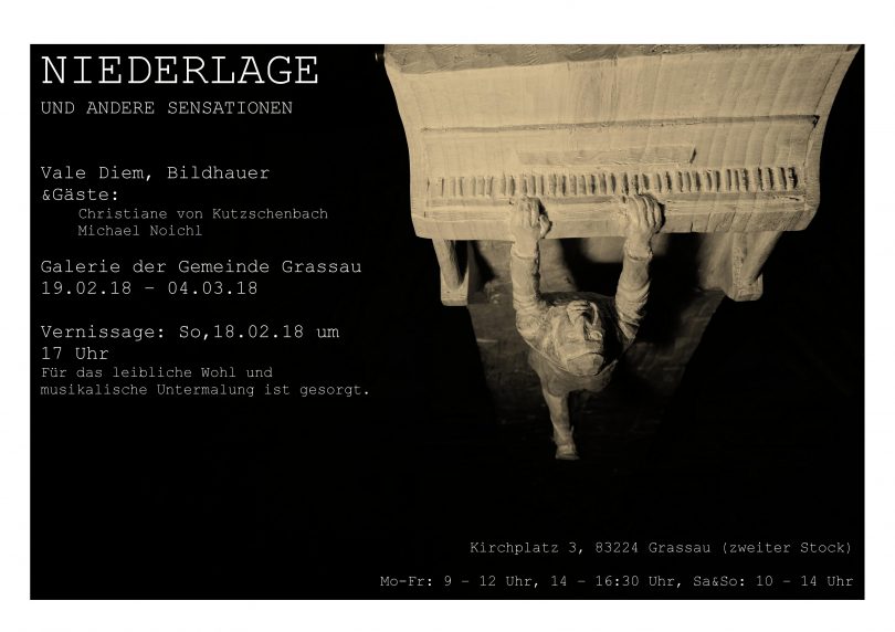 Am Sonntag, den 18. Februar, findet in Grassau in der Galerie der Tourist-Info die Vernissage zur Ausstellung von Valentin Diem mit Gästen statt. Unter dem Titel “Niederlage” präsentieren Diem und die Gäste Christiane von Kutzschenbach und Michael Noichl ihre Kunstwerke aus den Bereichen Bildhauerei, Aquarell, Metall und Treibholzarbeit. Beginn ist um 17 Uhr. Für das leibliche Wohl und musikalische Untermalung ist gesorgt.