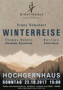 Diesmal präsentiert die neue Konzertreihe die Verbindung von Natur und Kultur auf besondere Weise: Franz Schubert´s Meisterwerk “Winterreise” auf 1461 m Höhe mit besonderem Arrangement: Eine außergewöhnliche Vorstellung am 22.10.2017 um 15:00 Uhr auf dem malerisch gelegenen Hochgernhaus. Idyllischer Hüttenflair, herrliche Aussicht auf das Kaisergebirge, den Dachstein und die Zugspitze und mittendrin zwei junge Musiker mit besonderem Talent: Thomas Schütz (Bariton) und Alexander Kuralionok (Akkordeon). Sie führen den wohl bekanntesten aller Liederzyklen auf- erstmals mit einer eigens dafür arrangierten Akkordeonbegleitung.