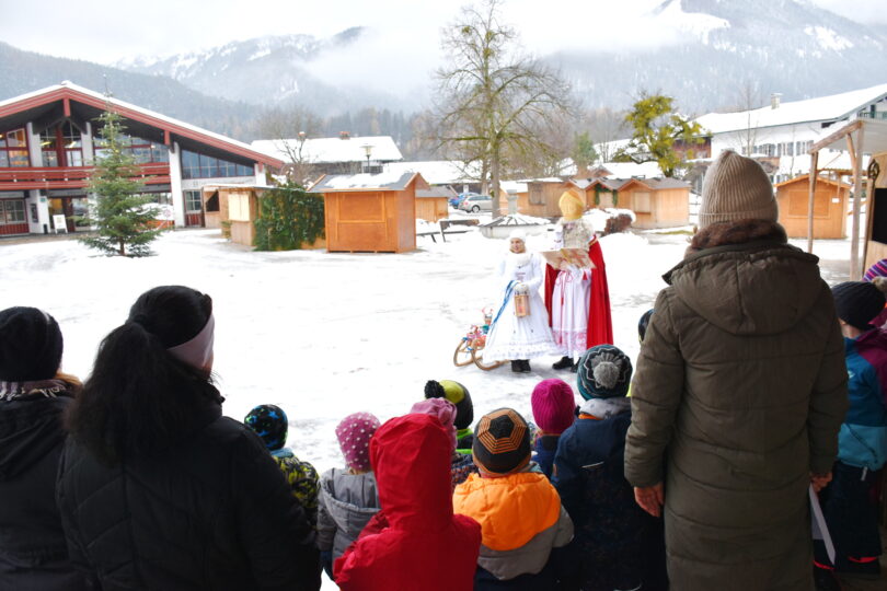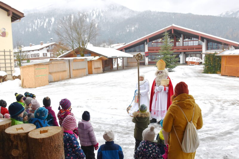 Schon tagelang gab es kein anderes Thema im Kindergarten Schleching, als die Frage, ob der Nikolaus in diesem Jahr kommt. Die Freude war groß, als der Nikolaus in seinem roten Mantel, mit Stab und Mitra und dem wunderschönen Engel an seiner Seite auf den Dorfplatz schritt, wo ihn die Kinder schon im Musikpavillon erwarteten. Begrüßt wurde er mit einstudierten Liedern.
