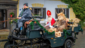 Der Nikolaus ist mit dem Krampus und einer festlich geschmückten Kutsche voller Geschenke unterwegs. Vor der Kulisse eines weihnachtlich dekorierten Hauses macht das Gespann kurz Halt, bevor die nächste Station auf dem Samerberg angesteuert wird – bereit, Kindern eine Freude zu bereiten und ein Stück Adventstradition lebendig zu halten.