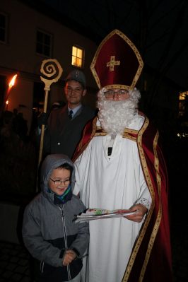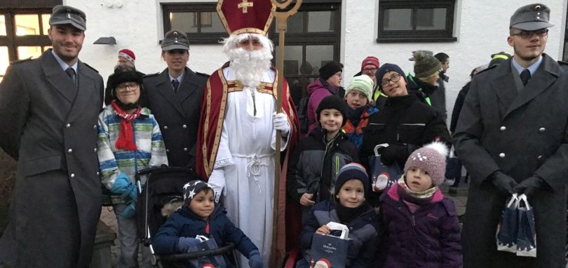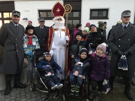 Seit 59 Jahren kommt der heilige Nikolaus von der dritten Kompanie des Gebirgsjägerbataillons 231 aus Bad Reichenhall ins Behandlungszentrum nach Aschau. Ob so – wie früher – im Hubschrauber oder in der Kutsche, ob mit Tragtieren und Musikkapelle oder so wie heute auf dem Pferderücken: der Heilige lässt seine Kinder im Behandlungszentrum an seinem Namenstag nicht alleine: sehnsüchtig warteten sie den ganzen Tag auf ihn und staunten, als er beim Einbruch der Dunkelheit quer über die Felder von Aufham her hoch zu Ross und begleitet von einer Schar Gebirgsjäger mit leuchtenden Fackeln im Franziskushof eintraf. Der heilige Bischof begrüßte alle Kinder des Behandlungszentrums, aus seinem großen Goldenen Buch las er viel Gutes über die Kinder im Behandlungszentrum, in der Kinderklinik und in der Tagesstätte; zu seiner besonderen Freude trugen sie ihm Lieder und Gedichte vor und überreichten handgemalte Bilder. Die Soldaten der dritten Kompanie des Gebirgsjägerbataillons 231 bescherten – nach viel Lob für alle im Auftrag des Heiligen – die Kinder aus dem Behandlungszentrum und aus dem Dorf mit einem Sackerl voller Leckereien: Äpfel, Nüss und Mandelkern.