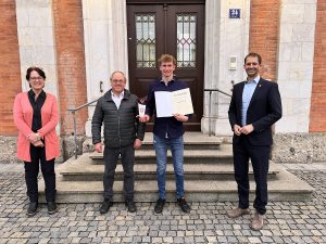 v.l.n.r.: Kathrin Rohrmüller, SfL-Vorsitzende; Konrad Hollerieth, Trainer; Nico Paufler, Rosenheimer Sportler des Jahres 2021; Andreas März, Oberbürgermeister