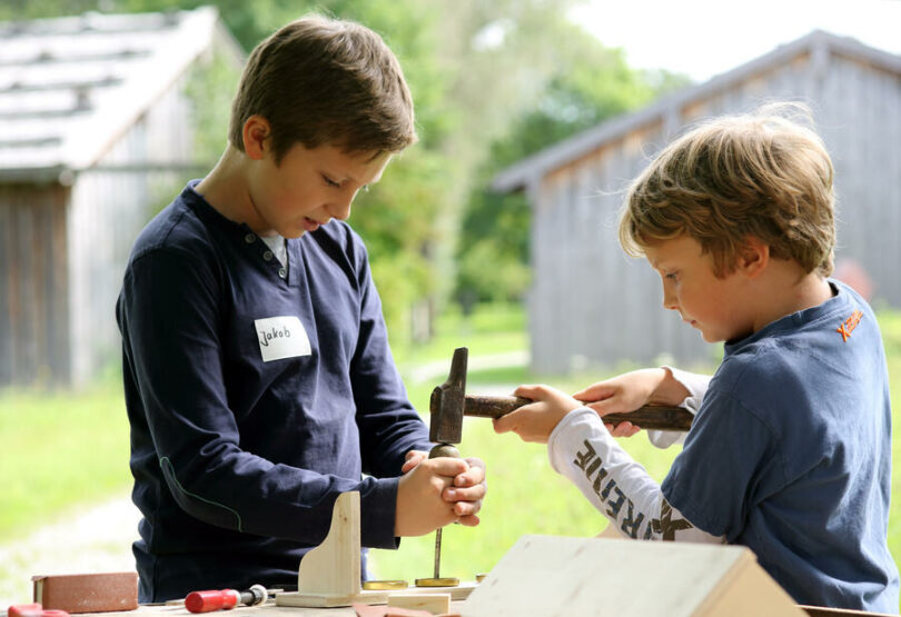 Bericht und Foto: BHM Amerang:  BHM_Nisthilfen bauen.jpg: Werkfreudige kommen bei diesem Kinderprogramm im Bauernhausmuseum auf ihre Kosten © Bezirk Oberbayern, Archiv BHM Amerang.
