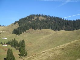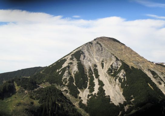 Bei einer ausgiebigen Rast auf dem baumbestandenen Berggipfel, der nach Nordosten sehr steil abfällt, genießen wir das großartige Panorama. Hier oben hat man einen grandiosen Blick auf die zu Füßen liegende Karalm, das Kaisergebirge, die Zentralalpen und die Berggipfel der Umgebung.
