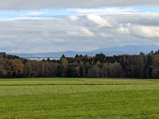 Ich erreiche die Anhöhe, von wo aus sich mir ein sanfter Blick auf die umliegende Natur eröffnet. Auch der Chiemsee ist zu sehen, doch die Berggipfel bleiben hinter dem Hochnebel verborgen. Vorbei an der “Alten Villa” geht es weiter die Heubergstraße hinunter nach Ernstdorf, wo ich links in die Kranzhornstraße und dann wieder links in den Anny-Auerbach-Weg einbiege.