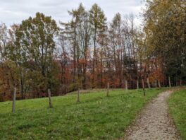 Ich beginne meinen Rundgang an der evangelischen Kirche, wo man gut parken kann. Von hier aus geht es leicht bergauf. Die Laubbäume, die in den letzten Monaten in goldenen Farben leuchteten, verlieren jetzt ihre letzten Blätter, die wie ein Teppich auf den Wegen liegen und jeden Schritt dämpfen. Der Herrnberg zeigt sich im November von seiner melancholischen Seite.