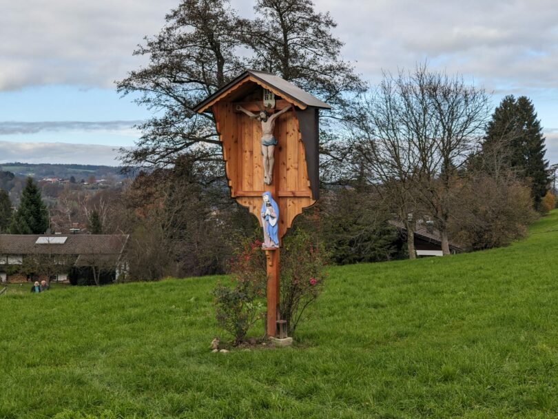 Ich erreiche die Anhöhe, von wo aus sich mir ein sanfter Blick auf die umliegende Natur eröffnet. Auch der Chiemsee ist zu sehen, doch die Berggipfel bleiben hinter dem Hochnebel verborgen. Vorbei an der “Alten Villa” geht es weiter die Heubergstraße hinunter nach Ernstdorf, wo ich links in die Kranzhornstraße und dann wieder links in den Anny-Auerbach-Weg einbiege.