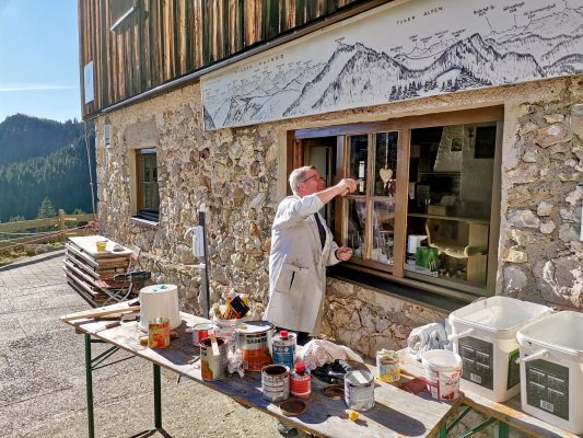 Die auf 1.410 Metern hoch im Naturschutzgebiet Geigelstein liegende Priener Hütte der Priener Sektion des Deutschen Alpenvereins braucht immer wieder eine Auffrischung. Die jüngste davon gelang in diesen corona-bedingten Schließzeiten und aufgrund des sonnigen Novemberwetters dem Hüttenwart Herbert Ass, der sich zusammen mit seinem Vereinskameraden Paul Panzer aus Prien um den Neuanstrich der Außenfassade einschließlich der Eingangstüre bemühte. „Die herrliche Aussicht auf das überwältigende Panorama der nahen Tiroler Bergwelt mit Zahmen und Wilden Kaiser konnten wir zwar nicht dauerhaft genießen, schön war aber, dass wir in aller Ruhe zur Verschönerung der Priener Hütte beitragen konnten“ – so Herbert Aß, der mehrmals im Jahr mit Paul Panzer auf dem Berg war, um sich für die Priener Hütte und auch für das nahe dort aufgestellte Kreuz einzusetzen. Monika Becht als Hüttenwirtin bedankte sich bei den Fassadenmalern und Bergkameraden mit einer gescheiten Brotzeit.