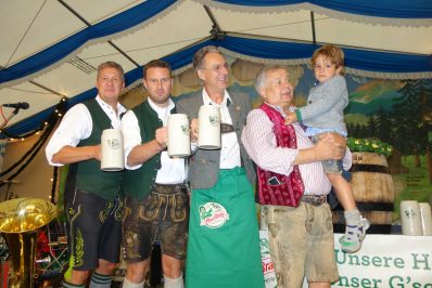 Markus Baumann und Marco Steinacher von Auerbräu Rosenheim, Bürgermeister Peter Solnar und Festwirt Werner Heinrichsberger mit Enkel Laurent