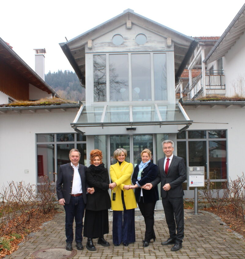 Gemeinsam vor dem „Haus am Steinbach“: Rolf Gärtner (Zukunft trotz Handicap e. V.), Petra Schubert (Caritas), Andrea Hanisch (Zukunft trotz Handicap e. V.), Bürgermeisterin Susanne Grandauer und Landrat Otto Lederer stehen für den Schulterschluss von Verein, Träger, Gemeinde und Landkreis bei der geplanten inklusiven Neunutzung des Gebäudes.