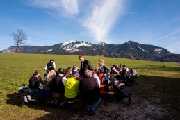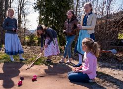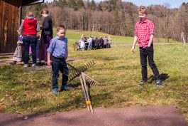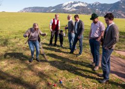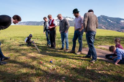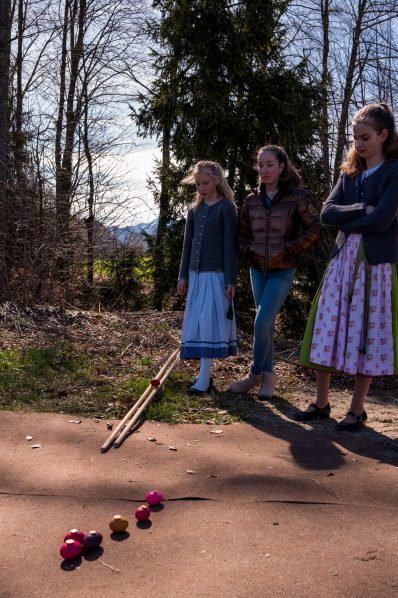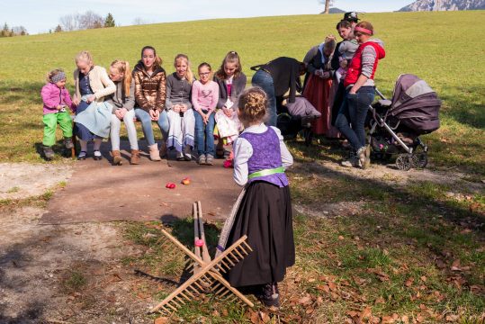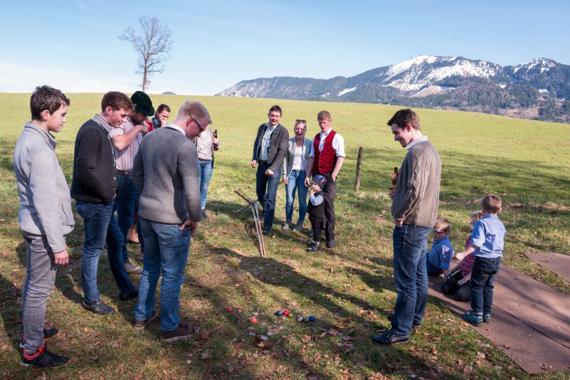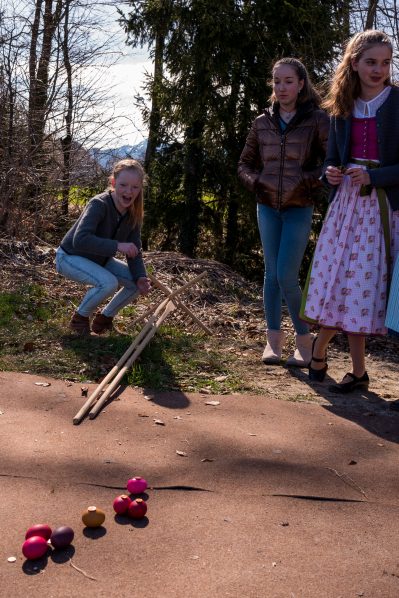 Die günstige Witterung am Ostermontag erfreute die Trachtler in Roßholzen. Sie konnten ihr traditionelles Oarscheibn nach dem eher winterlichen Ostersonntag bei schönem Frühlingswetter am Trachtenstadl in Hundham abhalten Die Familien trafen sich in Hundham wo noch niedriges Gras und eine kleine Böschung ist. Zwei große Rechen wurden so über Kreuz gelegt, dass die Stiele zusammen eine kleine Bahn ergeben. Auf diese Bahn legt man nun sein Ei und lässt es das Gefälle hinunter rollen. Wenn es zum stehen gekommen ist legt man auf sein Ei einen Cent (früher einen Pfenning). Der nächste an der Reihe der nun sein Ei hinunterrollt versucht nun durch die Richtung des Spitzes oder der stumpfen Rundung des Eies die selbe Laufbahn des Vorgängers zu erlangen. Wenn er das vorherige Ei oder ein anderes das schon im Gras liegt „anpeckt“ und der Cent runterfällt kann er diesen behalten. Manchmal streift ein Ei in seiner Laufbahn mehrere schon liegende Eier und alle Cents fallen runter. Dann kann der Mitspieler natürlich alle Cents einbehalten. “Das Oarscheibn war eine fröhliche Einstimmung auf unser Festjahr mit den Jubiläums-Veranstaltungen vom 14. August bis 20. August im Festzelt” – so Vorstand Martin Schober bei der österlichen Zusammenkunft.