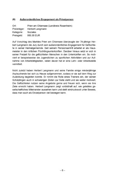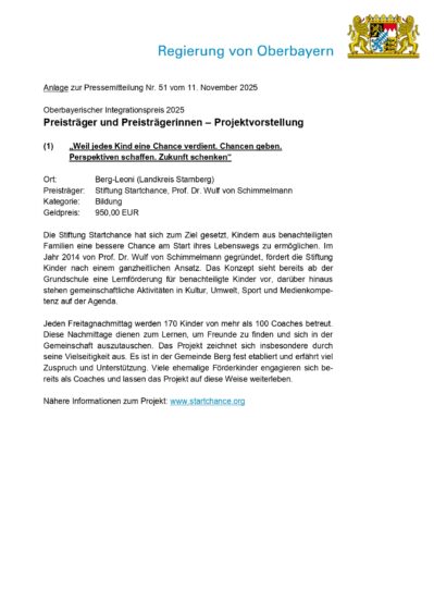 Das herausragende Engagement von Organisationen, Vereinen und Einzelpersonen aus dem Regierungsbezirk für eine gelingende Integration haben der Integrationsbeauftragte der Bayerischen Staatsregierung, Karl Straub, Regierungspräsident Dr. Konrad Schober und Regierungsvizepräsidentin Friederike Fuchs mit dem Oberbayerischen Integrationspreis gewürdigt. Das Preisgeld in Höhe von insgesamt 6.000 Euro wird in diesem Jahr auf sechs verschiedene Initiativen verteilt, die aus Berg-Leoni (Landkreis Starnberg), Prien am Chiemsee (Landkreis Rosenheim), Miesbach und der Landeshauptstadt München stammen.