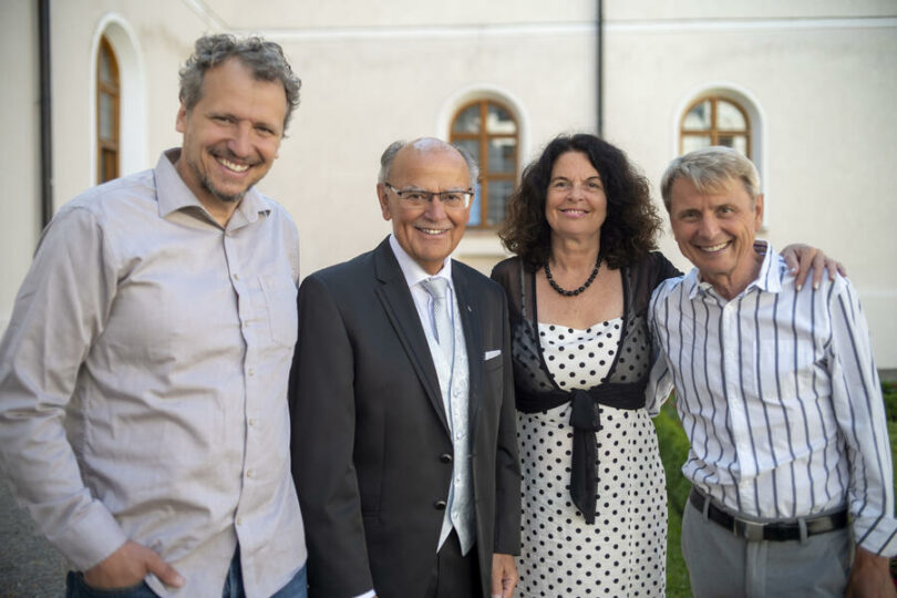 Große Freude über die Auszeichnung mit dem Oberbayerischen Kulturpreis 2023: Bezirkstagspräsident Josef Mederer (2. von links) mit den Preisträgern Marcus H. Rosenmüller (links) und dem Kinderlieder-Duo Sternschnuppe, Margit Sarholz und Werner Meier, in Kloster Seeon )
