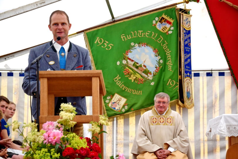 Am 2. und 3. Juni fand das 72. Almfest auf dem Jasberg statt. Der Trachtenverein d’Jasbergler Baiernrain freute sich über zahlreiche Gäste. Nachdem die Messe am Sonntag aufgrund des schlechten Wetters im Zelt stattfinden musste, wurde es über den Tag sonniger und immer mehr Gäste fanden den Weg auf den Jasberg. Auch am Montag war das Fest bestens besucht. Herr Pfarrer Slawomir Fijalkowski konnte im Rahmen der Festlichkeiten auf dem Almfest die neu restaurierte Fahne des Vereins segnen. Dafür ein herzliches Vergelts Gott. Außerdem wurden drei Mitglieder aus der alten Vorstandschaft feierlich verabschiedetet. Magdalena Hainz – 3. Jugendleiterin, Peter Hainz – 2. Vorplattler, Barbara Mayer – 2. Schriftführerin. Der Verein bedankt sich herzlich für die treuen Dienste in den letzten Jahren.