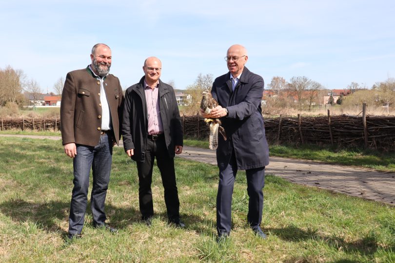 Bericht und Foto: Regierung Oberpfalz – Highlight zum Abschluss des Treffens: Regierungspräsident Walter Jonas durfte einen über viele Wochen gesund gepflegten Mäusebussard auswildern. Mit auf dem Bild: Christoph Bauer und Dr. Nobert Schäffer (Foto: Regierung der Oberpfalz/Stühlinger-Weinhändler)
