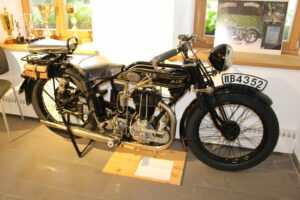 Ein wahres Kultstück, das Motorrad der Firma AGO Landmaschinen Anton Guggenberger GmbH aus dem Baujahr 1924, mit einem Hubraum von 300 ccm, dem Viertakt JAP- Motor aus England, der Wulstreifen und einer Carbid Beleuchtung.