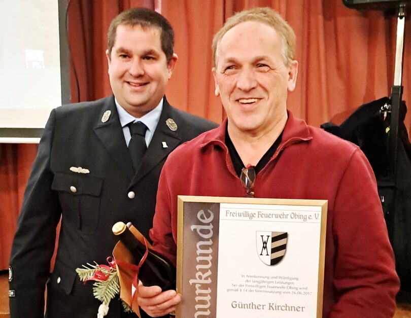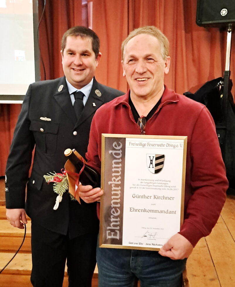 Bericht und Foto: Emmy Künzner-Hingerl – Simon Frank 1. Vorstand der Obinger Feuerwehr überreicht Günther Kirchner in Anerkennung und Würdigung für seine langjährigen Leistungen bei der Freiwilligen Feuerwehr Obing die Ehrenurkunde. Gemäß § 14 der Vereinssatzung vom 26.07.2017 wird Günther Kirchner mit Datum vom 29. November 2025 zum Ehrenkommandanten ernannt. Herzlichen Glückwunsch auch im Namen der Gemeinde Obing.