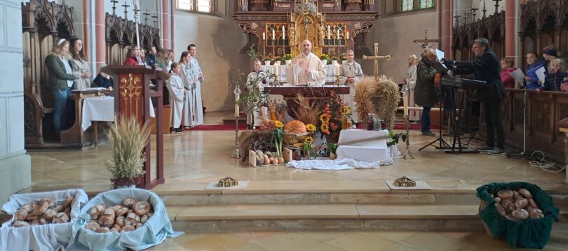 Gerade die Kinder sind es, die Hoffnung und Zukunft sind, so Pfarrer David Mehlich, als er eine Kinderschar zum gemeinsamen gebeteten „Vater unser“ um den Altar scharte. Vor dem Schlusssegen hat sich Pfarrer Mehlich bei allen bedankt, die diesen schönen Gottesdienst zu mitgestaltet, die Kirche so geschmackvoll dekoriert haben und segnete im Anschluss die neue Erntekrone, all die Früchte und Blumen vor dem Altar und die Minibrote, die nach dem Gottesdienst von der Landjugend zum Kauf angeboten wurden.