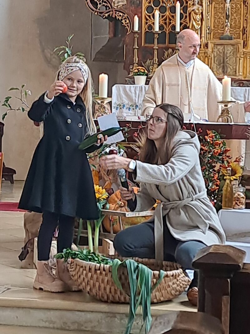 Was so ein Apfelbaum zum Wachsen und Gedeihen hat in einem heiteren Frage-Antwort-Spiel Melanie Thurner (Familiengottesdienst-Team) mit den kleinsten Gottesdienstbesuchern zusammengetragen. Alles was zum Erhalt, zum Wachsen des Baumes und zum Gedeihen der Äpfel erforderlich wussten ist, wurde von Mitgliedern der Landjugend und Vreni Linner, in einem heiteren Dialog erzählt, mit Verena Schneebinger haben die Kinder die unterschiedlichsten Erntegaben den Gottesdienstbesuchern vorgestellt, die sie zum Altar getragen haben.