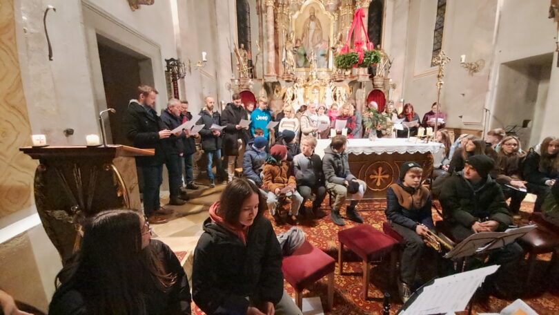 Normalerweise gibt Diakon Wolfgang Mösmang, wie er sagt mit einem freudigen und lachenden Auge, weil er sich schon auf nächstes Jahr freut. Dieses Jahr schwingt bei dem Diakon auch etwas Traurigkeit mit, weil es ungewiss ist, ob es ein nächstes Mal gibt. Mit einem ganz herzlichen Vergelt‘s Gott und einem Blumengruß bedankt sich Mösmang bei Gertrud Schwoshuber und erteilt im Anschluss den christlichen Segen. Mit einem bunten Medley vielen bekannter Weihnachtslieder, feiern die Mitwirkenden einen klangvollen Abschluss in der Kirche, ehe es dann auf den weihnachtlich geschmückten Dorfplatz hinaus ging, wo der Elternbeirat mit einer Brotzeit bereits wartete. Mit heißen Würsteln, Punsch fand die Adventfeier der GMS Obing einen griabigen Ausklang.