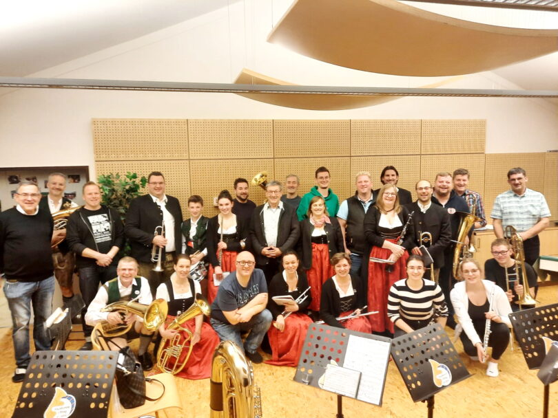 Foto: Eggstätter und Obinger Musikanten beim Patenbitten im Probenraum der Musikkapelle Obing