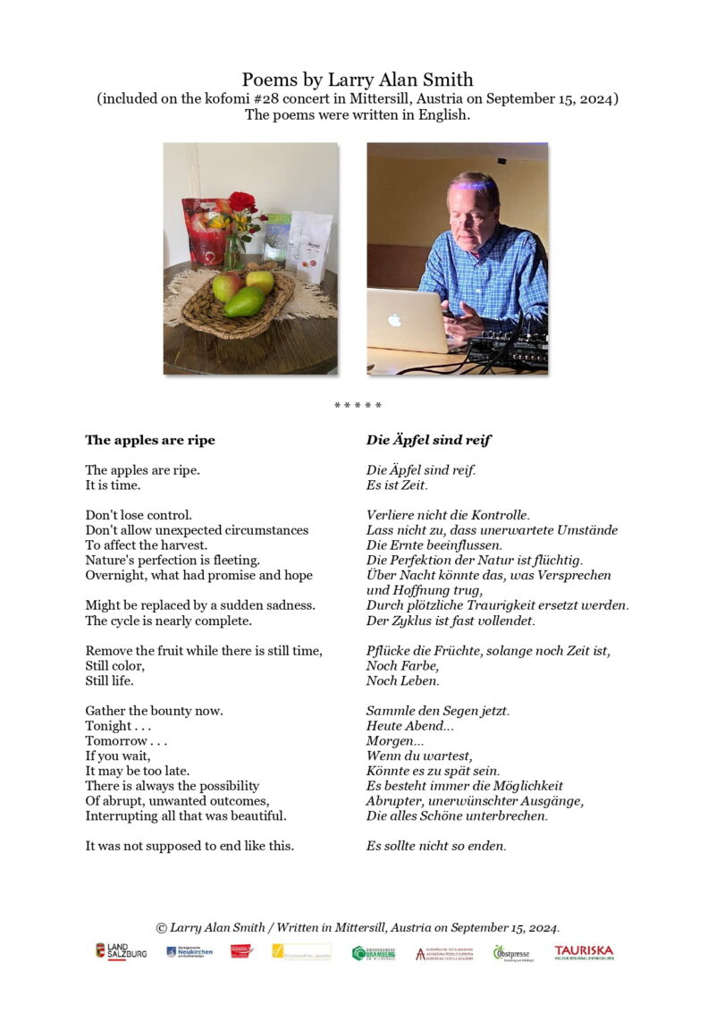 Mit einem schönen Gedicht, das uns ein Teilnehmer des Komponistenforums Mittersill (© Larry Alan Smith / Written in Mittersill, Austria on September 15, 2024) gewidmet hat, gehen wir in die Winterpause. Toni, Christian und das Obstpresse-Team.
