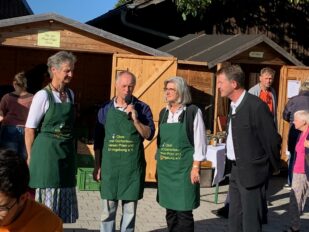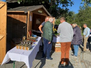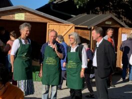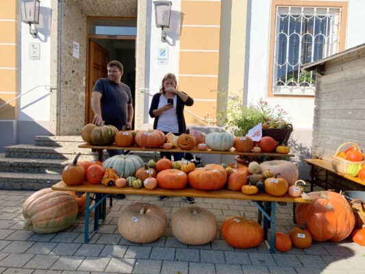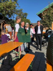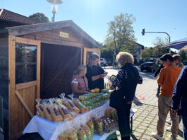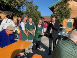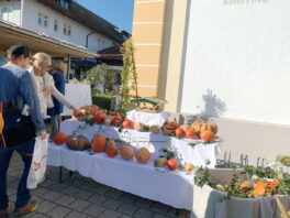 Vorstand Christian Steinbichler und Bürgermeister Andreas Fenzl eröffneten bei traumhaftem Herbstwetter gemeinsam den Apfelmarkt und freuten sich über die zahlreichen Besucher. „Leider sind aufgrund der Witterung in diesem Jahr kaum Äpfel im Angebot, dafür umso mehr Kürbisse“, so Steinbichler mit Blick auf die späten Fröste und die Unwetter im Sommer. Rund zwölf Aussteller boten auf dem Rathausvorplatz ihre regionalen Produkte zum Verkauf. Darunter erstmalig die Rimstinger Ortsgruppe des Katholischen Frauenbunds mit Handarbeiten, Türkränzen und Schmankerln aus Küche und Garten. Besonders beliebt neben Honig, Obstbränden, Most und weiteren Köstlichkeiten waren wie immer die Blumen und das Gemüse der Gärtnerei Stiftung Attl. Heilerziehungspfleger Matthäus Matejek und seine beiden Schützlinge Celine und Franz hatten alle Hände voll zu tun. Für die Verpflegung sorgten der Elternbeirat der Grundschule Rimsting sowie der Obst- und Gartenbauverein selbst. Suppe, Würstel, Crepes, Kuchen und der frisch gepresste Trauben- und Apfelsaft des Veranstalters fanden zahlreiche Abnehmer.