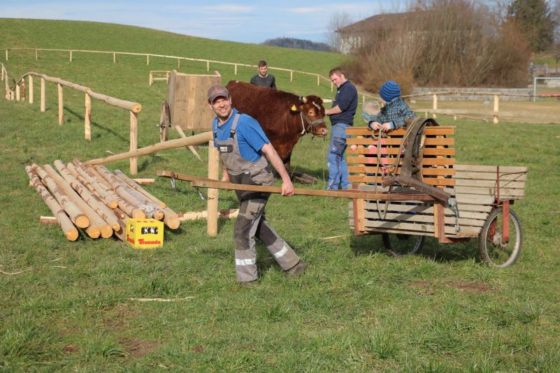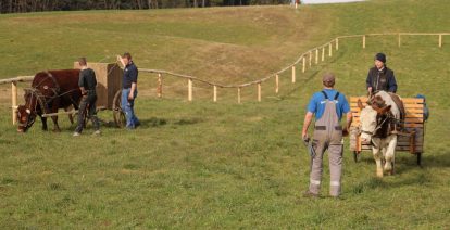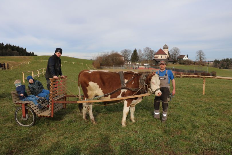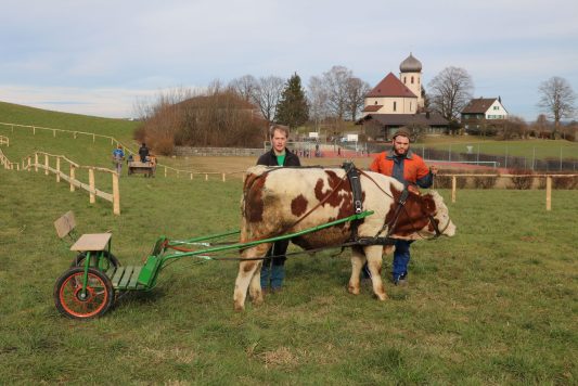 Qualifying auf der Wildenwarter Rennbahn! Nur noch eine Woche bis zum großen Auftritt: am Faschingssonntag 23. Februar pünktlich um 13 Uhr ist der Start zum ersten Vorlauf des dritten internationalen Ochsenrennens auf der Rennbahn an der Wildenwarter Kirche. Mindestens zwei Jahre müssen die Ochsen alt sein, damit sie mitmachen dürfen. Elf Starter – alle zwischen zwei und drei Jahren und tierärztlich untersucht – haben sich für den großen Preis von Wildenwart gemeldet und sind seit Wochen eifrig im Training. Zu einem ersten Trainingslauf trafen sich einige der Ochsen, zusammen mit ihren Treibern, auf dem Rundkurs unterhalb des Röselsberges. Ein echter Favorit war beim Qualifying noch nicht zu erkennen, alle Rennteilnehmer spielten mit verdeckten Karten: „Ja die anderen nicht wissen lassen, wie gut man selber ist“.