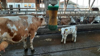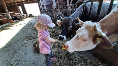 Neben der Vielfalt an Tierarten und der Bewirtschaftung des Betriebes nach den Demeter-Richtlinien, gehen die Kronasts auch in der Kälberaufzucht einen besonderen Weg: Die Kälber dürfen mindestens 6 Wochen bei der Mutter bleiben und direkt am Euter trinken. Diese sogenannte muttergebundene Kälberaufzucht bedeutet mehr Tierwohl für Kuh und Kalb, aber auch weniger Kälberkrankheiten. „Die Kälberaufzucht den Profis überlassen, nämlich den Müttern“, so beschreibt es Georg Kronast. „Der Milchviehstall ist so großzügig gebaut, dass es möglich ist die Kälber einfach in der Herde mitlaufen zu lassen. Wir haben mit diesem System gute Erfahrungen gemacht.“ Das scheint auch das Kalb zu sagen, das die Besucher frech und munter vom Laufgang des Stalles aus beobachtet.
