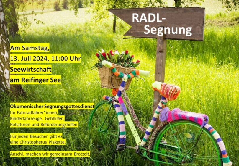 Grassau/Achental. Ein ökumenischer Segnungsgottesdienst für Fahrradfahrer, Kinderfahrzeuge, Gehhilfen, Rollatoren oder andere Beförderungshilfen findet für alle Interessierten im Achental am Samstag, 13. Juli, um 11 Uhr statt. Die Radlsegnung wird von Diakon Johannes Notter und seinem evangelischen Kollegen Diakon Michael Soergel durchgeführt. Der Ort ist am Reifinger See nahe der Seewirtschaft. Da der heilige Christophorus, Schutzheiliger der Reisenden ist und im Juli seinen Gedenktag hat, bekommen alle Teilnehmer eine Christophorus-Plakette, die sie an ihren Fahrzeugen befestigen können. Anschließend an die Segnung wird gemeinsam Brotzeit gemacht.