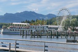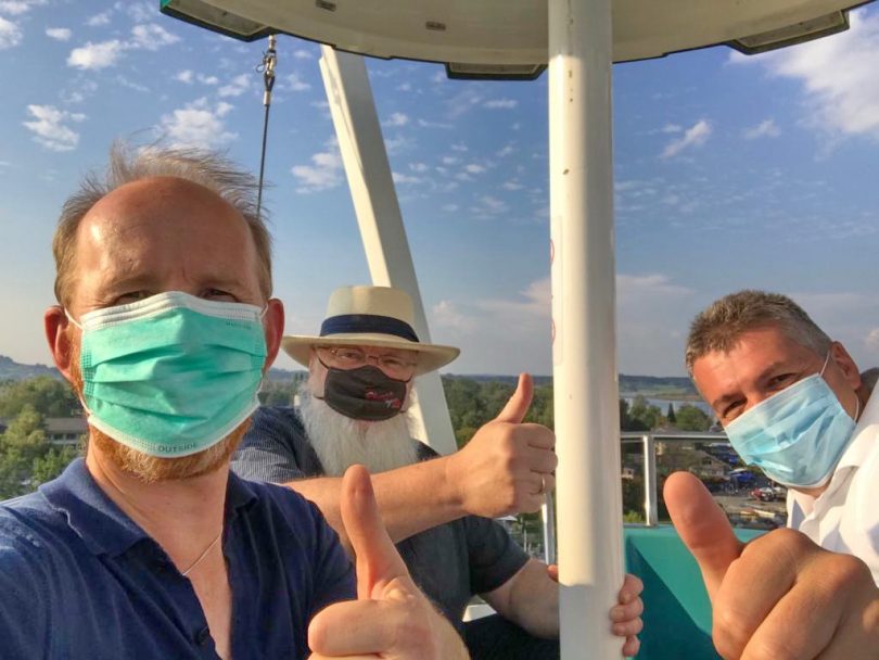Dem Himmel ein schönes Stück näher kamen – von links- Priens Pfarrer Klaus Hofstetter (Katholische Pfarrgemeinde und Pfarrverband Westliches Chiemseeufer), Pfarrer Karl-Friedrich Wackerbarth (Evangelisch-Lutherische Gemeinde) und Apostel Andreas Sargant (vormals Gemeindevorsteher in Prien) von der Neuapostolischen Kirche beim ersten Ökumenischen Riesenradeln in Prien. Nach ihrer Rückkehr und den wunderbar genossenen Aussichten auf den Chiemsee und auf die Chiemgauer Bergwelt war sich das ökumenische Trio einig, dass sich das Riesenradeln gelohnt hat und ein schönes Gemeinschaftserlebnis war. “Das können wir unseren Schäflein nur weiterempfehlen” – so der gemeinsame Tenor zum Priener Riesenrad, das noch bis einschließlich Sonntag, 27. September täglich von 10 Uhr bis 20 Uhr im Hafen der Chiemsee-Schifffahrt steht.