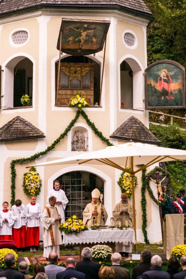 Um 8.45 Uhr wird der Zelebrant, SE Weihbischof Rupert Graf zu Stolberg, München, vor der Pfarrkirche Sachrang von der örtlichen Geistlichkeit, dem Ersten Bürgermeister, dem Vorsitzenden des FK Müllner Peter, der Gebirgsschützenkompanie Aschau und der Bevölkerung empfangen. Um 9.15 Uhr erfolgt die Aufstellung zum Zug vor der Pfarrkirche und um 10 Uhr Beginn des Festgottesdienstes an der Ölbergkapelle, musikalisch gestaltet vom Müllner-Peter-Chor, der Musikkapelle Wildenwart, den Aschauer Alphornbläsern und den Schwarzenstoaner Sängerinnen, musikalische Gesamtleitung Kirchenmusikerin Frau Christine Klinger. Die Ehrenkompanie stellt heuer wieder die Gebirgsschützenkompanie Aschau.