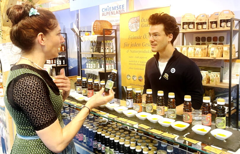 Foto: Hötzelsperger – Marius Schmidinger als Standbetreuer von Ölmühle Garting am Gemeinschaftsstand von Chiemsee-Alpenland auf der Berliner Grünen Woche bei der Beratung einer Kundin.