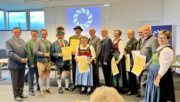 Bei der Bundestagung des Bundes der Österreichischen Trachten- und Heimatverbände (BÖTH) in Schlierbach im Salzkammergut kam es zu einer besonderen, grenzüberschreitenden Ehrung. Rupert Klein, der wiedergewählte Präsident des BÖTH bedankte sich bei Max Bertl, dem Ehrenvorsitzenden des Bayerischen Trachtenverbandes mit der Dankes-Medaille in Gold und sagte dabei: „Der Max hat in all den Jahren als Zweiter und als Erster Landesvorsitzender vom Bayerischen Trachtenverband die Nähe und Freundschaft zu unseren Trachtenverbänden in Österreich gesucht, mit seiner herzlichen Art hat er aus der Nachbarschaft an uns einen guten Dienst erwiesen“. Max Bertl war in Begleitung der Landesschriftführerin Hildegard Hoffmann. Sie vertrat Landesvorsitzenden Günter Frey und sie war die erste Frau, die Bayern bei einer österreichischen Bundestagung vertrat. „Meine eigene Begeisterung für das Ehrenamt ist gut angekommen“ – so die Funktionärin in ihrem Rückblick auf die drei Tage währende Tagung.