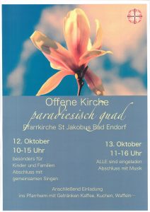 Der Pfarrvervband Bad Endorf lädt am Samstag, 12. Oktober und am Sonntag, 13. Oktober zur offenen Kirche St. Jakobus ein – unter dem Motto: “Paradiesisch guad”. Die Einladung gilt vor allem an alle interessierten Gläubigen und Familien – näheres zum Programm siehe Anlage.