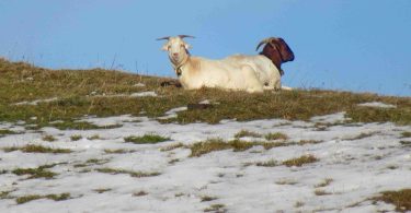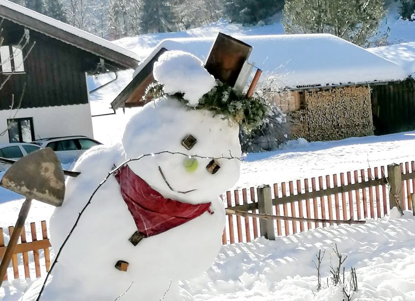 Auf ziemlich wackeligen Füßen steht im Aschauer Priental dieser Schneemann. Aber halt: ist das wegen des schönen Schals eventuell gar eine Schneefrau? Am besten wir bezeichnen dieses vorübergehende Kunstwerk als Schneefigur. Um eine wirklich gute Figur handelt es sich nicht unbedingt, denn der schiefe Halt lässt nach. Wie wird das erst bei Tauwetter sein?