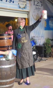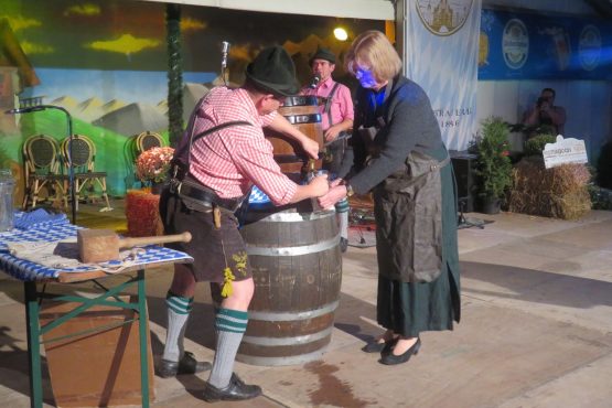 Höhepunkt war der traditionelle Fassbieranstich durch die Bürgermeisterin. Mit drei kräftigen Schlägen war es eine Höchstleistung für eine Frau, das Festbier aus dem Holzfass fließen zu lassen.