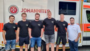 Gründungsmitglieder des Oldtimerstammtisches Bierwang um Michael Huber (4.v.l.) mit dem Johanniter Nico Maier (r.) beim Besuch der Rettungswache. (Foto: Johanniter / Erol Coskun)