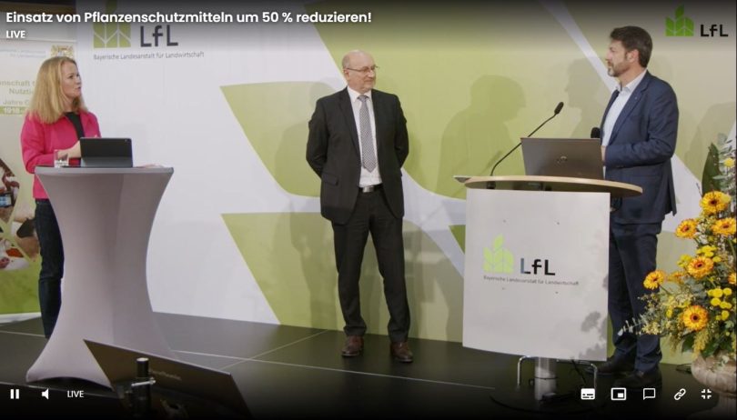 Das politisch gesetzte Reduzierungsziel von 50 % soll 2028 erreicht sein. Ja, das ist möglich, so LfL-Präsident Sedlmayer in seinem Eingangsstatement. Das kann der komplette Verzicht auf chemisch-synthetisch Pflanzenschutzmittel sein, wie im Ökolandbau oder durch Umwandlung von Ackerland in Brache. Den größten Beitrag zur Reduktion leistet die Umstellung auf Ökolandbau. 30 % Ökofläche sollen es bis 2030 werden. Zusätzlich sind Reduktionen im konventionellen Ackerbau notwendig. Mit gesunden, weniger krankheitsanfälligen Sorten und Prognosemodellen können beispielsweise Behandlungen gegen pilzliche Krankheitserreger vermieden werden. Unkraut hacken statt spritzen liegt in Reihenkulturen im Trend, heute schon mit automatisch gesteuerten Hackgeräten, zukünftig auch mit Robotern. Im Getreide kann auch im konventionellen Anbau ein Striegel gegen Verunkrautung eingesetzt werden, im ökologischen Landbau ist dies gängige Praxis. Mit modernen Geräten können Pflanzenschutzmittel wesentlich zielgerichteter und effizienter eingesetzt werden, wenn beispielsweise mit automatischen Lenksystemen und Section Control unnötige Überlappungen beim Spritzen vermieden werden. Auch pflanzenbauliche Maßnahmen wie die Fruchtfolgegestaltung sind zentral, so verhindert eine erweiterte Fruchtfolge Probleme mit Verunkrautung und Krankheitsdruck.