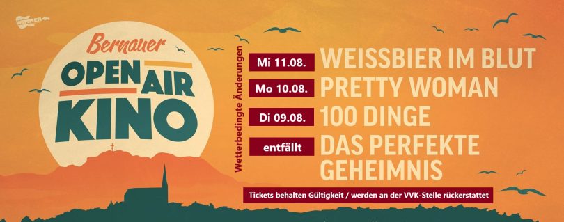 Auf Grund der anhaltenden Regenfälle können die Filmvorführungen beim Bernauer Open Air Kino nicht wie geplant abgehalten werden, sondern müssen erneut umdisponiert werden. So beginnt die Freiluft-Kino-Reihe im Kurpark nun erst am Montag, den 09.08. mit dem Hollywoodklassiker „Pretty Woman“ und musikalischem Vorprogramm von der HausBänd. Am Dienstag, den 10.08. folgt die Matthias Schweighöfer und Florian David Fitz Komödie „100 Dinge“ und die Besucher können sich vorab auf Filmmusik freuen, die die Musikkapelle Bernau vorträgt. Den krönenden Abschluss macht die gefeierte Kinoneuheit „Weißbier im Blut“ am Mittwoch, den 11.08, die eigentlich bereits am Sonntag gezeigt werden sollte. Die geplante Vorstellung am Samstag mit der Komödie „das perfekte Geheimnis“ entfällt als einzige Veranstaltung bedauerlicherweise ersatzlos.