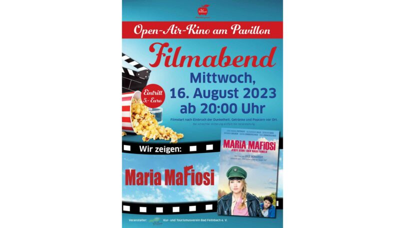 Einlass ist ab 20 Uhr, der Filmstart beginnt nach Einbruch der Dunkelheit. Gezeigt wird der heitere Beitrag „Maria MaFiosi oder Jeder sehnt sich nach Familie“ von Jule Ronstedt mit Lisa Maria Potthof (Susi aus den Eberhoferkrimis), Alexander Held, Serkan Kaya, Monika Gruber, David Zimmerschied und Sigi Zimmerschied in den Hauptrollen. Der Eintritt beträgt 5,00 Euro. Bei schlechter Witterung entfällt die Veranstaltung