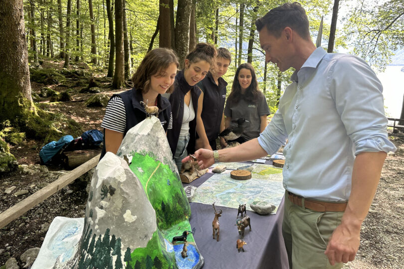 Die Studentinnen Lea, Lina, Linda und Rosina (v.l.) kennen sich bestens aus im Nationalpark Berchtesgaden: Nahezu täglich informieren sie Gäste an Besucherschwerpunkten über Themen wie Nationalparke allgemein, Prozessschutz, Insekten, Almen, Geologie und vieles mehr. Die vier jungen Frauen sind Teilnehmerinnen des so genannten „Umweltpraktikums“, das deutschlandweit in insgesamt 22 Schutzgebieten angeboten wird. Bereits seit 1990 fördert die Commerzbank das „Umweltpraktikum“, das jungen Menschen in einem Open-Air-Semester das Sammeln von Erfahrungen für die spätere Berufswahl ermöglicht. Jonas Frank (r.), Leiter der Commerzbank-Filialen Traunstein, Rottach-Egern und Rosenheim, besuchte die Studentinnen kürzlich bei ihrem Einsatz am Königssee und informierte sich über ihre Aufgaben im Umweltpraktikum. Neben den so genannten „mobilen Ständen“ an Besucherschwerpunkten unterstützen die Studentinnen weitere Bildungsprojekte, darunter Aktivitäten im Nationalparkzentrum „Haus der Berge“ sowie die Kindergruppen. Die Commerzbank finanziert und organisiert das Praktikum, die Schutzgebiete übernehmen die fachliche Betreuung der Studierenden. Auch im kommenden Jahr wird die Commerzbank das „Umweltpraktikum“ deutschlandweit anbieten, Bewerbungen sind ab November 2024 möglich.