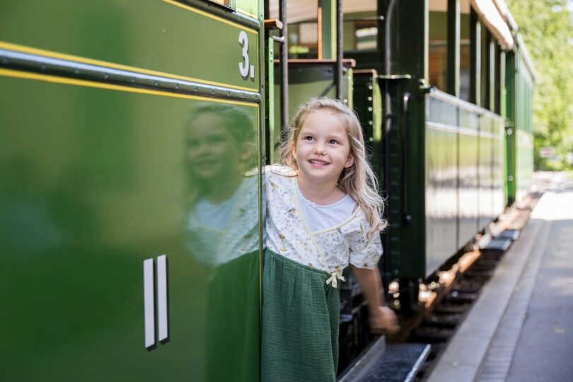 Zum Foto: Falls die „Bockerl-Bahn“ gerade nicht zwischen Ortskern und Hafen unterwegs ist, können die jungen Teilnehmerinnen und Teilnehmer der „See-Insel-Königs G´schicht´n für Familien“ am Gleisende der Chiemsee-Bahn in die Lok einsteigen.