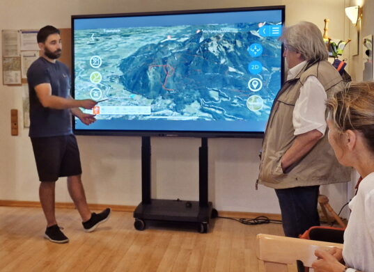 Der Bereitschaftsleiter berichtete: “Neben dem Bergwachtheim mit Bergrettungswache und Depot im Ortsteil Freiweidach in Marquartstein nutzt die Bereitschaft eine Diensthütte am Hochgern im Gemeindebereich von Unterwössen.”. Stellvertretender Bereitschaftsleiter Raphael Stöttner: “Neue, verbesserte Möglichkeiten zur Einsatzplanung und Einsatznachbesprechung bietet uns die kürzlich angeschaffte große digitale Arbeitstafel, ein Bildschirm mit verschiedenen interaktiven Funktionen.”. Raphael Stöttner weiter: “Unser Fuhrpark besteht aus einem Geländefahrzeug des Herstellers Toyota, Modell “Land Cruiser” mit Spezialausstattung und einem All-Terrain-Vehicle (ATV), konkret einem Quad, dessen Fortbewegung mit Rädern und, gerade im Winter für Schnee und Eis, mit Raupen erfolgen kann. Zum Transport des ATV in Einsatzortnähe nutzen wir einen Anhänger.”. Achim Tegethoff und Christian Tegethoff stellten verschiedene Einsatzausrüstungen mit deren jeweiligen Bekleidungen samt zugehörigen Gegenständen und Werkzeugen vor. Die konkrete Ausrüstung bestimmt sich entscheidend nach der Art des Einsatzes. Neben einer Grundausrüstung gibt es – abhängig von der Ausbildung und Spezialisierung der Einsatzkraft – weitere Ausrüstungen.