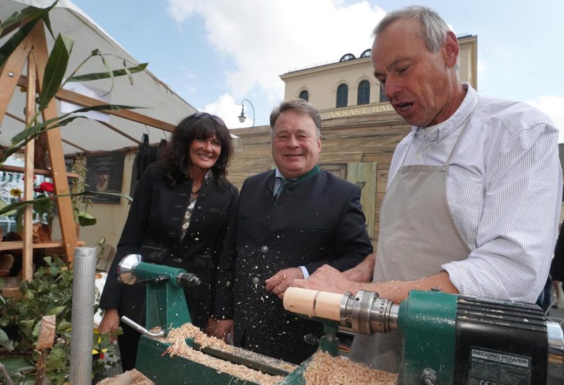 Die spätsommerlichen Temperaturen haben dem inzwischen traditionellen Riesen-Bauernmarkt im Herzen Münchens am Sonntag rekordverdächtige Besucherzahlen beschert. Tausende Besucher drängelten sich schon zur Mittagszeit durch die 120 Stände, um die kulinarischen Köstlichkeiten aus Bayerns Regionen zu probieren und traditionelle Handwerkskunst mit nach Hause zu nehmen. Unter den Anbietern war auch die Holzdrechslerei Schober aus Hutthurm im Landkreis Passau. Landwirtschaftsminister Helmut Brunner stattete dem Stand bei seinem Eröffnungsrundgang einen Besuch ab und ließ sich in die Geheimnisse der Drechsel-Kunst einweisen.